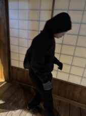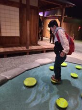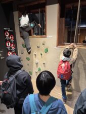 NINJA館の忍術体験ゾーンでは、ロープを使って壁越えをし、水術の体験にも挑戦しました。